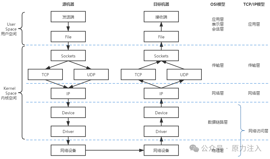 图中传输模型的左侧,笔者特别标出了网络栈在用户与内核空间的部分,可见几乎整个网络栈(应用层以下)都位于系统内核空间之中,之所以采用这种设计,主要是从数据安全隔离的角度出发来考虑的。由内核去处理网络报文的收发,无疑会有更高的执行开销,譬如数据在内核态和用户态之间来回拷贝的额外成本,因此会损失一些性能,但是能够保证应用程序无法窃听到或者去伪造另一个应用程序的通信内容。针对特别关注收发性能的应用场景,也有直接在用户空间中实现全套协议栈的旁路方案,譬如开源的Netmap