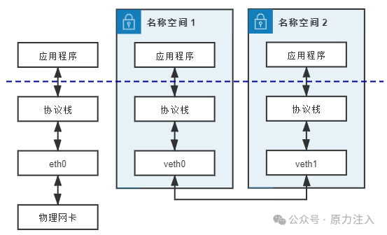 veth 是另一种主流的虚拟网卡方案,在 Linux Kernel 2.6 版本,Linux 开始支持网络名空间隔离的同时,也提供了专门的虚拟以太网(Virtual Ethernet,习惯简写做 veth)让两个隔离的网络名称空间之间可以互相通信。直接把 veth 比喻成是虚拟网卡其实并不十分准确,如果要和物理设备类比,它应该相当于由交叉网线