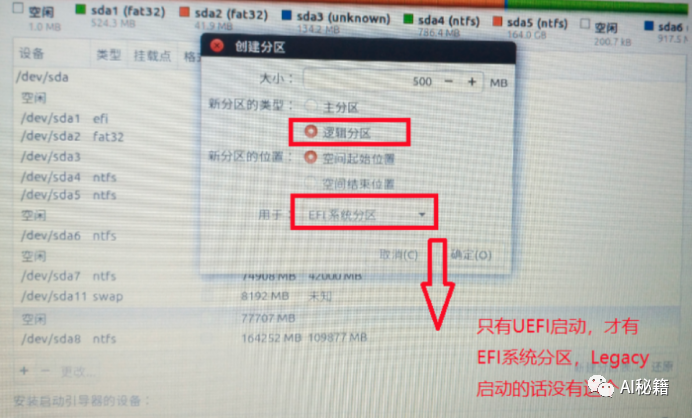 /boot:存放ubuntu内核,用来引导系统的,如果是Legacy启动就要设置引导,UEFI就不用设置这个(UEFI要设置EFI文件)