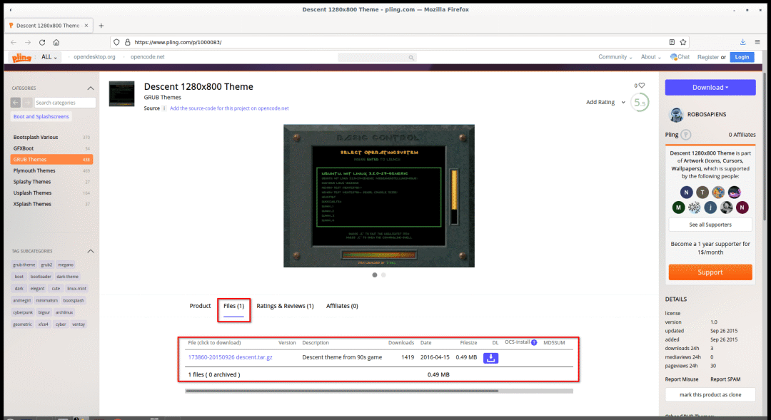 在主题主页,单击 文件(Files) 标签页。你将会在图像预览的下方找到这个标签页。单击文件链接来下载它。