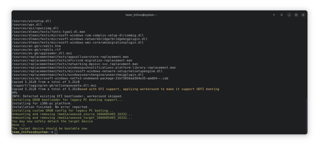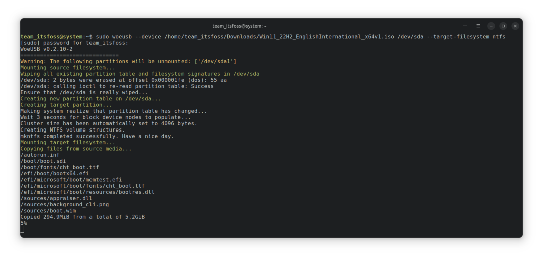 在这里,--device 标识用于擦除 USB 和从零开始创建一个可启动 USB 驱动器。同样,--target-filesystem 标识用于设置为 NTFS ,来避免将要复制的文件大小超过 FAT 文件系统的限制。