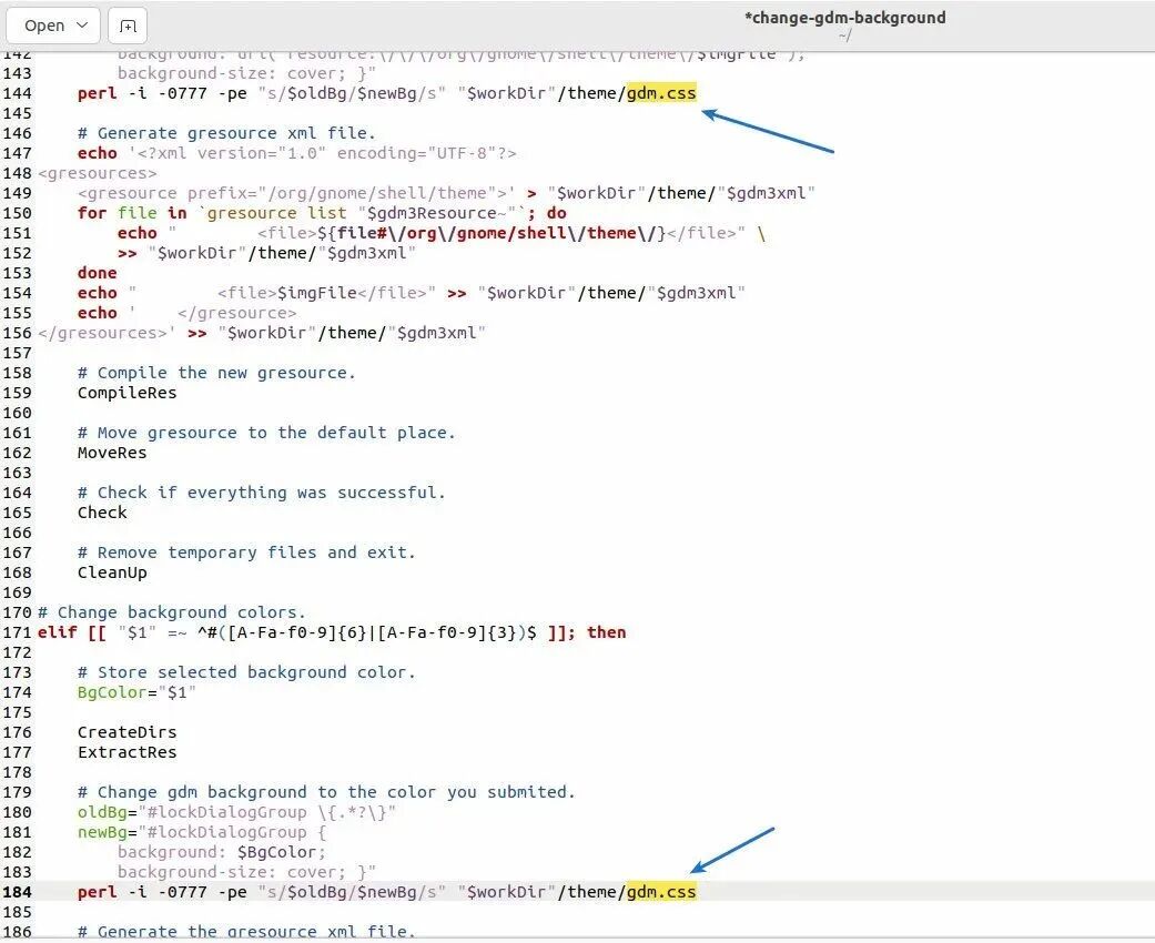 接下来,转到下面的两行(#144 和 #184)。将 gdm3.css 更改为 gdm.css 。如下图所示。