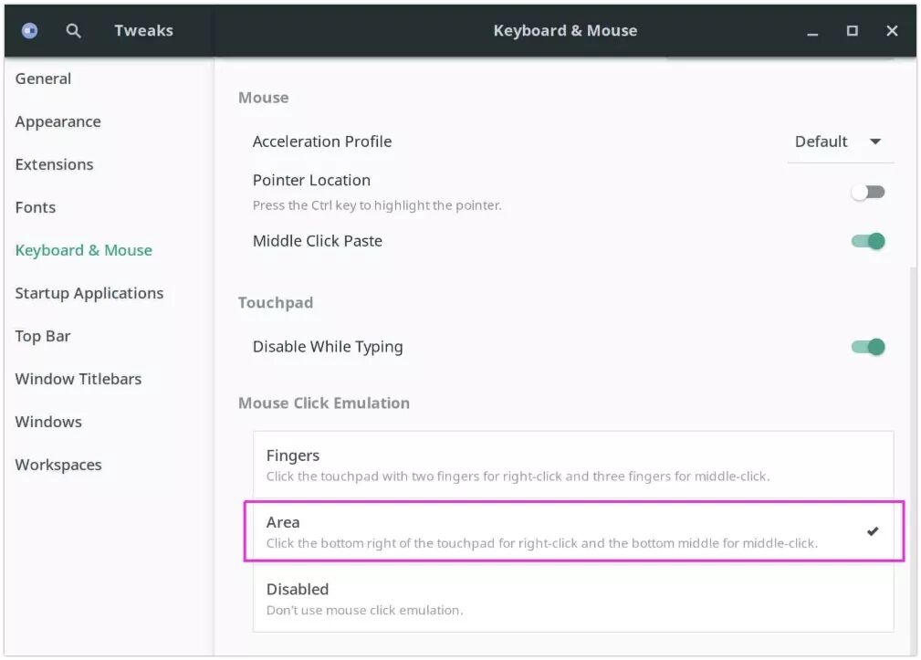 启动 GNOME Tweaks >> 键盘和鼠标 >> 鼠标点击硬件仿真,并选择“区域”选项。
