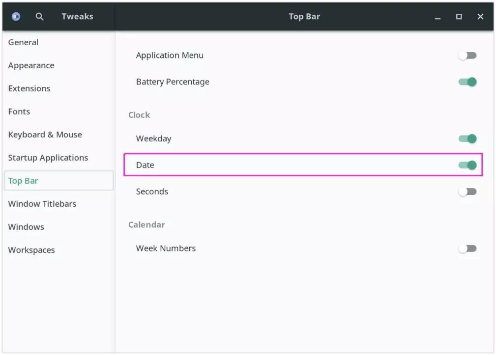 对于日期修改: 打开 GNOME Tweaks >> 顶部栏 ,并在时钟下启用“星期”选项。