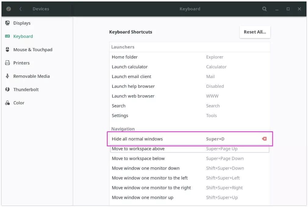 设置 >> 设备 >> 键盘 >> 单击在导航下的 隐藏所有普通窗口 ,然后按 Super 键 + D ,最后按设置按钮来启用它。