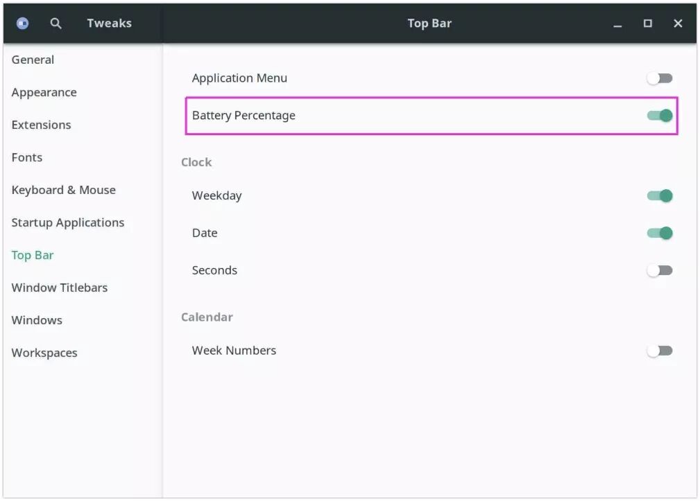 启动 GNOME Tweaks >> 顶部栏 >> 电池百分比 ,并打开它。