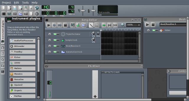 我们的两个音乐家使用多用途的现代音乐创建工具 LMMS[13]。它带有一个绝妙的采样和效果库,以及多种多样的灵活的插件来生成独特的声音。LMMS 的学习曲线令人吃惊的低,在某种程度上是因为其好用的节拍/低音线编辑器。