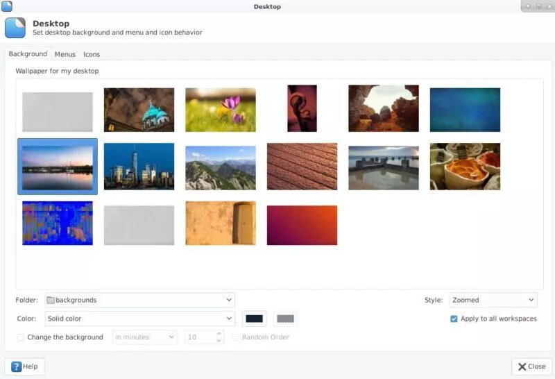 为在 Xfce 中更改桌面背景,在桌面上右击,并单击桌面设置。从文件夹选择中选择背景,并选择任意一个默认背景或自定义背景。