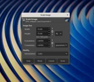 让我们假使我们需要缩小 Fedora 30 背景图像到它当前大小的 75%。为此,选择“图像Image -> 比例Scale”,然后在比例对话框上,在单位下拉列表中选择“百分比percentage”。接下来,输入 “75” 作为宽度或高度,然后按 Tab 键。默认情况下,其它尺寸将自动地调整大小,以相应地与更改的尺寸保持纵横比。现在,保存其它选项不变,并按比例。