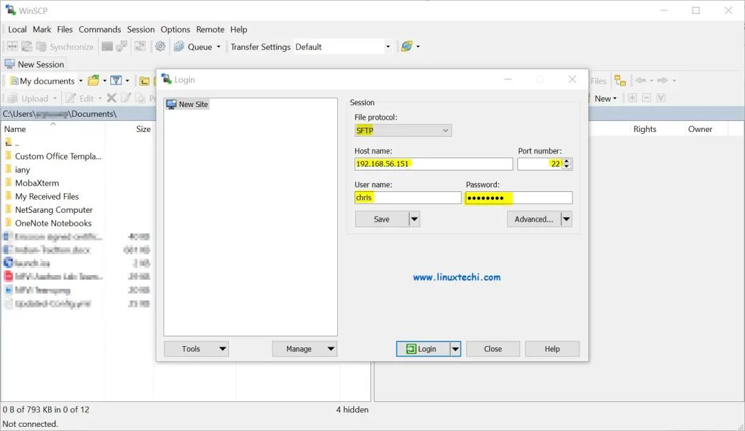 现在使用 winscp 工具来测试 sftp 服务,输入 sftp 服务器 IP 地址和用户的凭证: