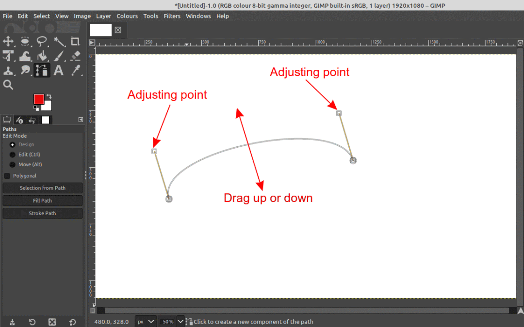 创建一个新的图像或打开一个现有的图像。选择 “工具 -> 路径”,然后大致考虑曲线文本的位置,通过分别单击路径点的开始点和结束点来创建路径。
