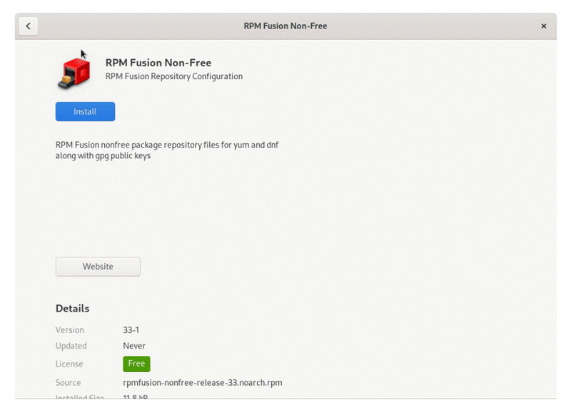 RPM Fusion 建议先安装 free 存储库。因此,单击针对你 Fedora 版本的 free 存储库的链接。然后会打开一个窗口来询问你是否想安装该存储库。单击安装。