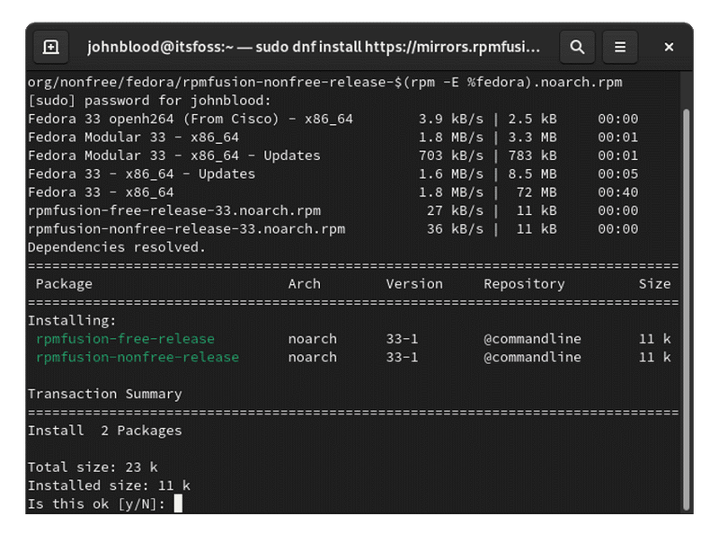 为启用 Fedora 的第三方存储库,输入下面的命令到你的终端中:
