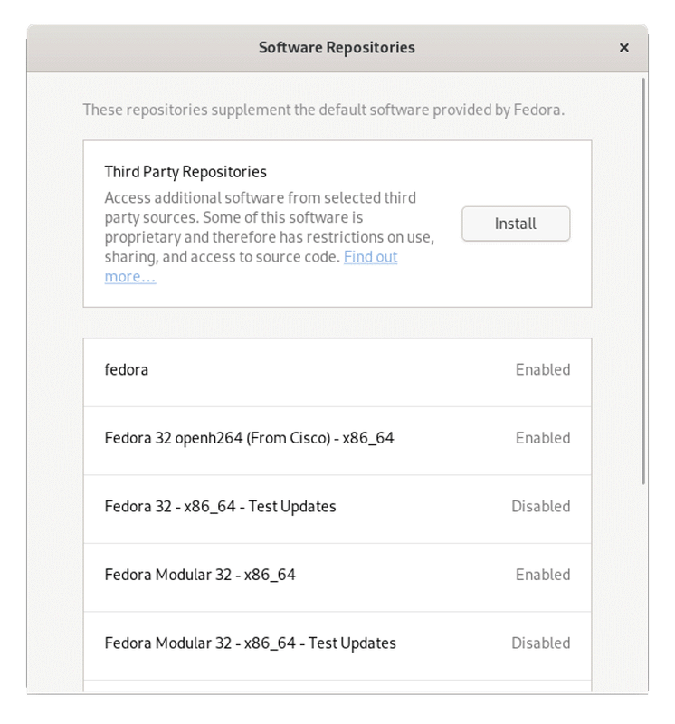 在软件存储库窗口中,你将在其顶部看到写着 “第三方存储库” 字样的部分。单击“安装”按钮。当你被提示时,输入你的密码。