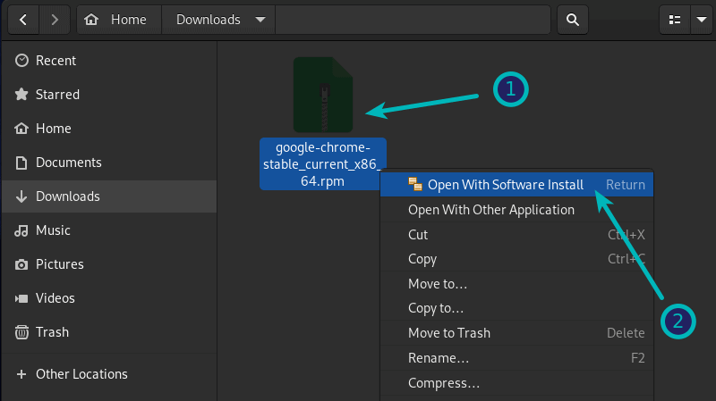 在 Fedora 中使用默认的软件中心是最简单的方法。它真地很简单。转到你下载的 .rpm 文件的文件夹位置。它通常在 “Downloads” 文件夹。