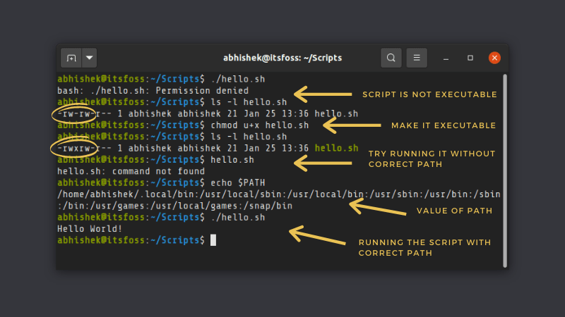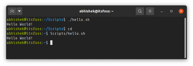 abhishek@itsfoss:~/Scripts$ cat hello.sh