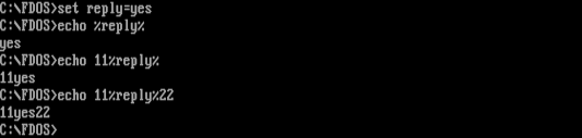 在名称前后使用百分符号是非常重要,因为这就是 FreeDOS 知悉变量名称在哪里开始和结束的方式。这是非常有用的,因为它会允许你引用一个变量的值,与此同时,它会立即附加(或预置)其它的文本到值中。让我通过设置一个新的名称为 reply 的值为 yes 的变量,然后在 “11” 之前和 “22” 之后引用这个值来演示这一点: