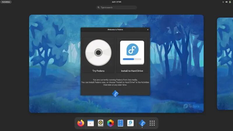 在数秒后,你应该会启动到 Fedora 临场会话期间,并会看到尝试或安装它的选项。选择 “安装到硬盘(Install to Hard Drive)” 。