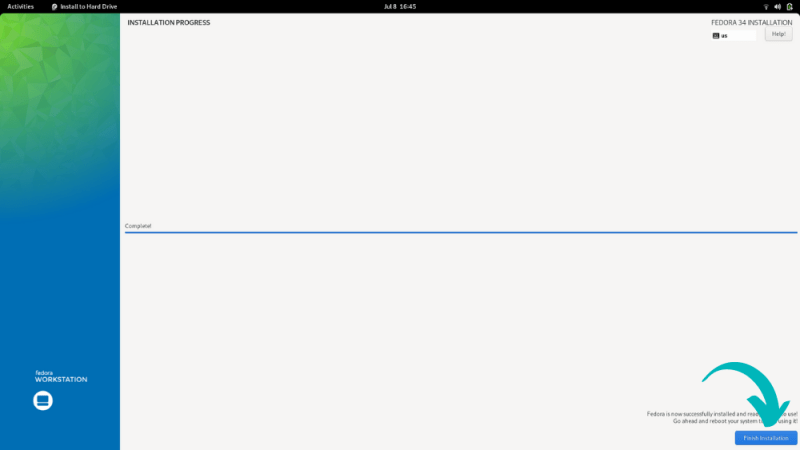 至此你几乎完成了安装。你注意到 Fedora 没有要求你输入用户名和密码了吗?很多发行版(像 Ubuntu )在安装期间会要求你创建一个管理用户。作为另一种方式,Fedora 会在你第一次登录到所安装的系统时给予你这个选项。