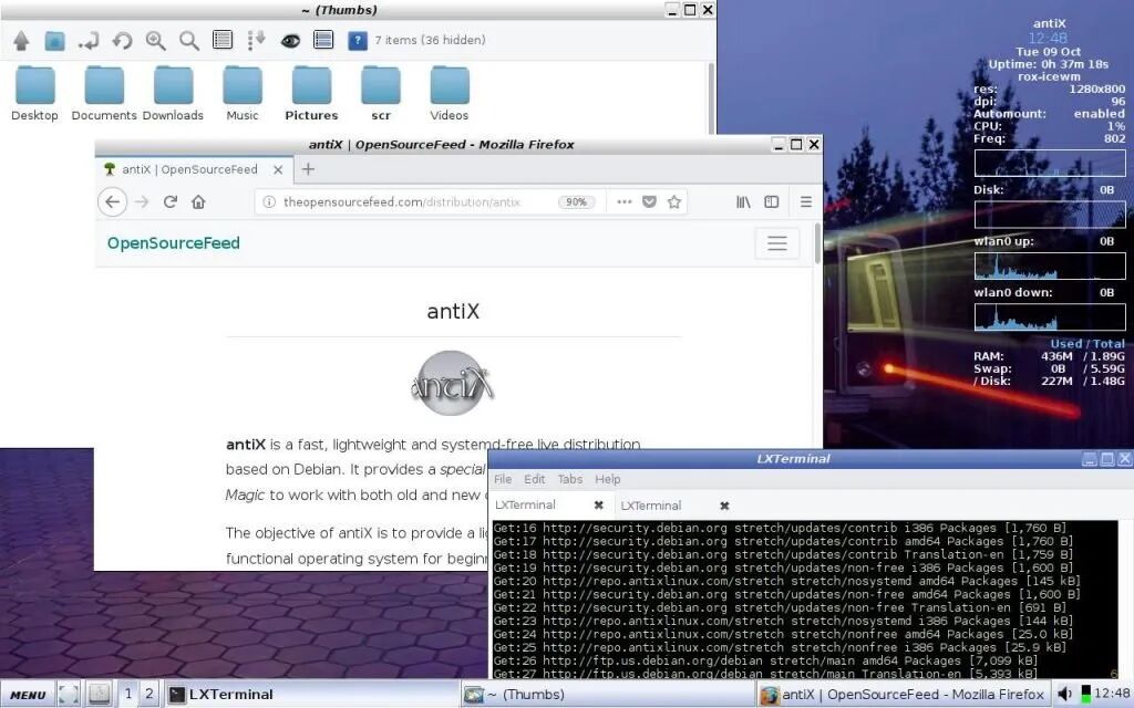 我们想重点推荐的另一款轻量级 Linux 发行版是 antiX Linux 。antiX Linux 基于 Debian 稳定分支,并带来一些吸引人的功能。在其核心,它使用 IceWM、Fluxbox 和 ROX 桌面环境,给予你一种优秀而快速的桌面体验。它完全没有使用 systemd,而是使用 sysVinit 和 runit 系统。antiX Linux 还为你提供了 32 位安装程序,并且还四个变体 – 完全版、核心版、基本版以及网络版,以满足不同的实际使用情况。