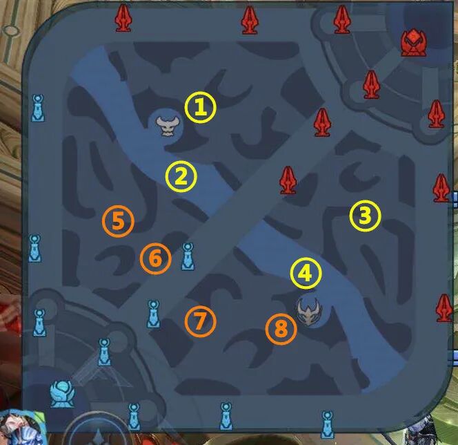 逆风局己方中路一塔掉了的话,就多占⑤⑥⑦⑧号草丛,尽量帮打野守住野区。