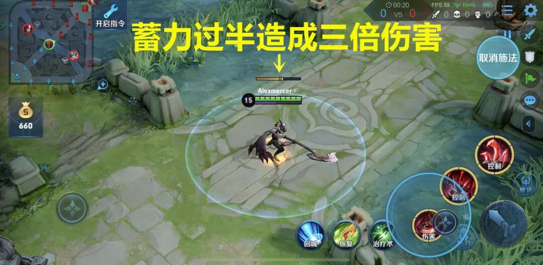 前中期清线以及打团一定要保证一技能蓄力条过半,另外探草丛时也要提前蓄力一技能进去,没有敌人就取消施法。