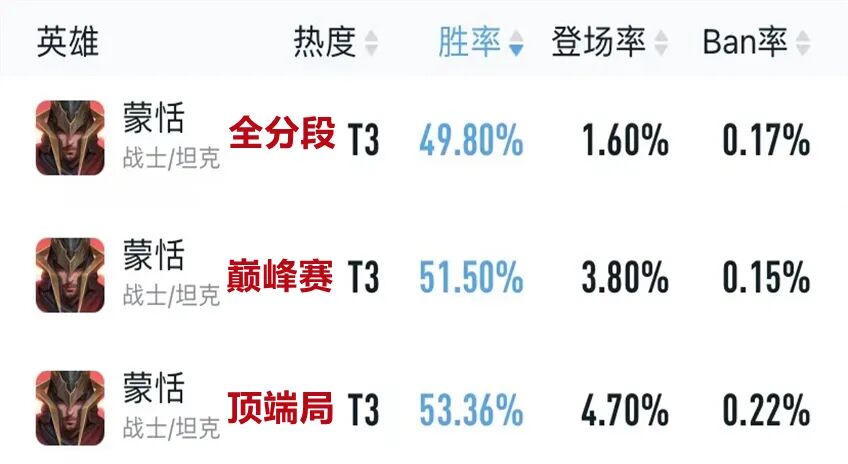 调整后蒙恬的胜率比上赛季提升了不少,巅峰赛1350以上分段胜率51.5%,顶端局排位胜率高达53.36%。