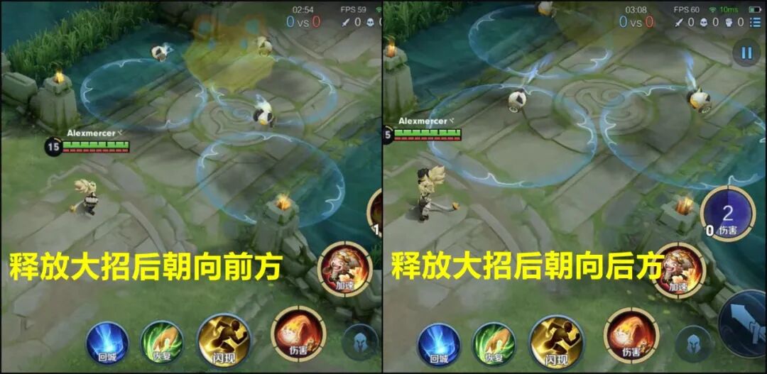 左图释放大招后移动轮盘对准前方,近距离有两颗分裂小炸弹,适合敌人站位靠前时使用。