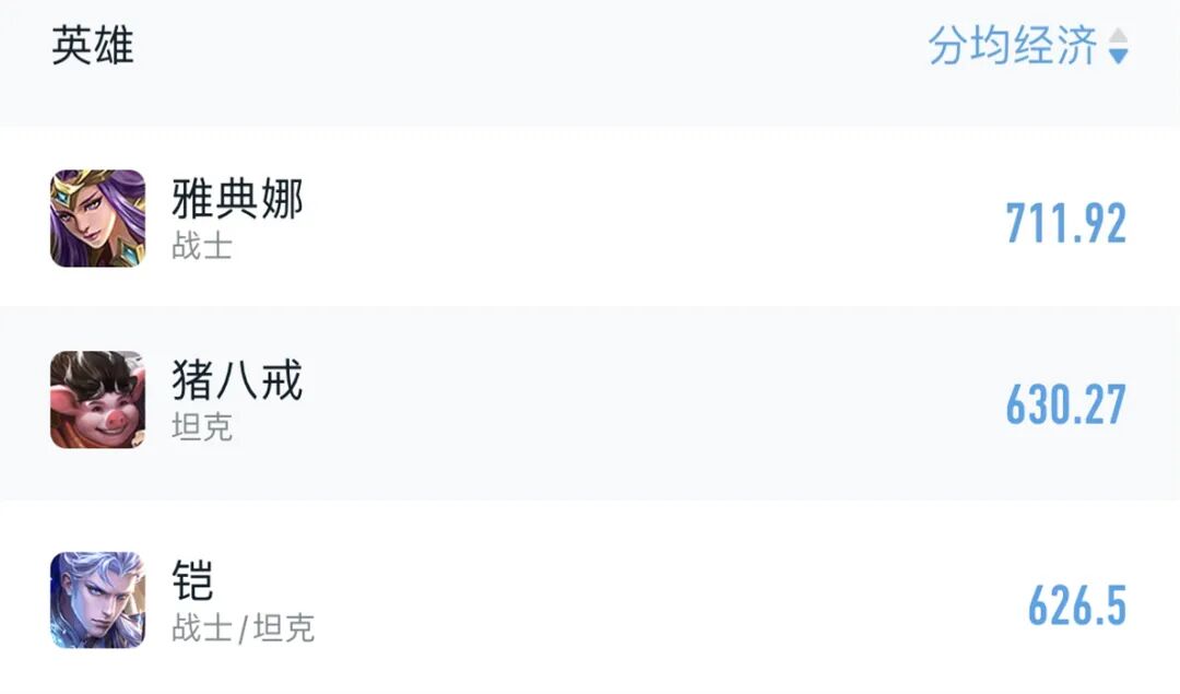 从数据可以看到,本赛季雅典娜分均经济711,而铠、猪八戒分均经济630左右,平均一局比赛下来能拉开1K以上的经济差。