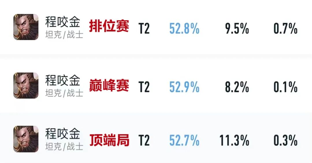 近期程咬金全分段、巅峰赛以及顶端局排位胜率都在52.5%以上,并且出场率也来到了10%左右,可以说是程咬金近两年以来最强的一个赛季。