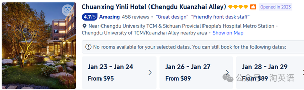我在成都预订了一个酒店,这是一家2023年新开的酒店,名字很难写也很难读。