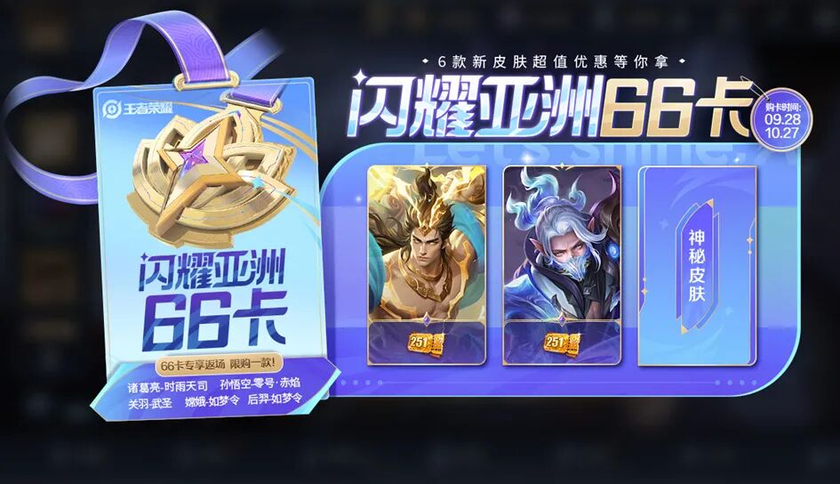 曼姐出品,必属优品。大家好,我是人见人爱的小曼姐。其实,王者荣耀新赛季已经过了一周的时间,相信很多玩家都在用版本之子上分吧?同时呢,王者荣耀中秋和国庆,还有亚运庆典已经是开启了,不少玩家因此回归。主要还是因为王者荣耀这次上架了闪耀66卡,同时还有一大批限定皮肤返场。