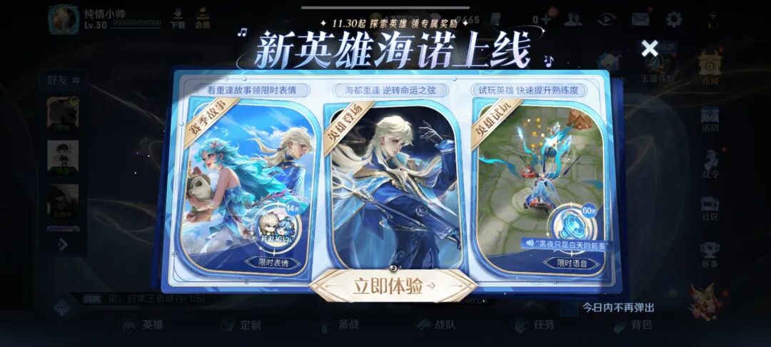 说海诺强度之前,我们来说说,海诺这个英雄的获取方式。众所周知,现在的新英雄一般都是可以通过试玩任务来免费获取的,海诺也不例外。玩家们只需要参加聆音活动,就能获得新英雄哦。另外,花13888金币或者388点券也能获得海诺。最后一个,就是通过58个英雄碎片,也是能够兑换海诺的哦。