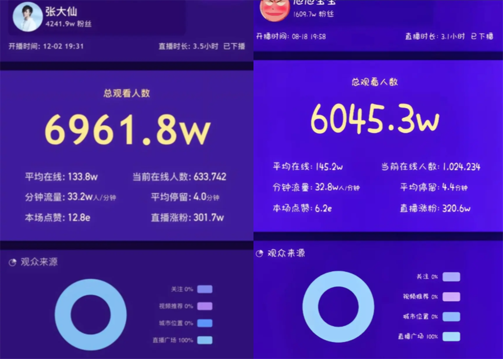 而在张大仙首播结束之后,这位王者一哥的首秀数据也是出炉了。身为前某牙一哥的张大仙,跟前某鱼的直播一哥旭旭宝宝,他们都在音符直播,所以很多人都将他们的首播数据做对比。