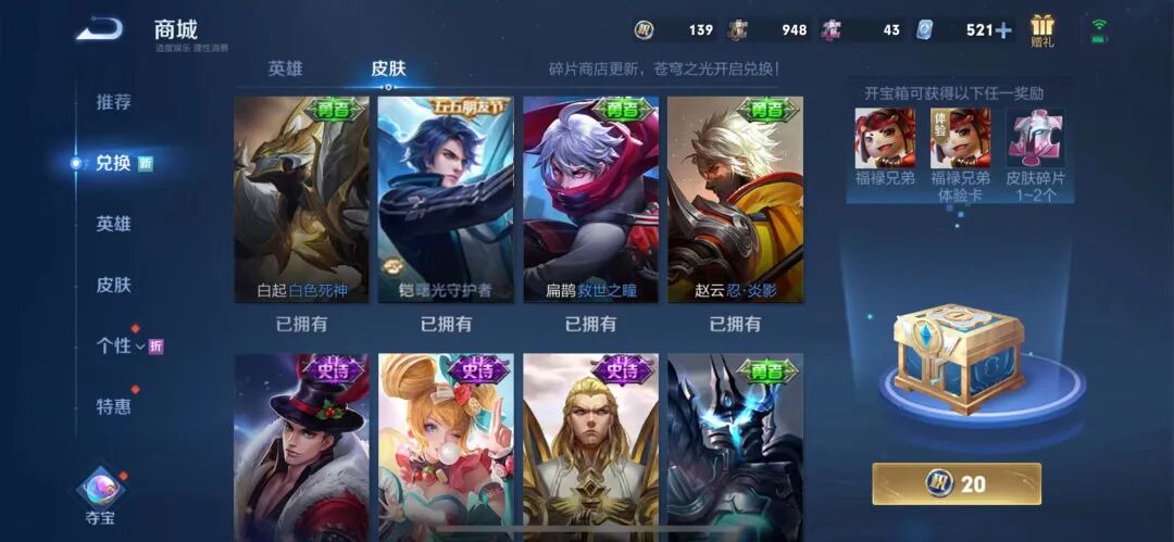 另外,王者荣耀碎片商城虽然本周更新了,但是没有新的史诗皮肤加入。要知道,之前几年王者荣耀12月份的上旬,都是有热门史诗进入碎片商店的。所以,大概率会是延期到12月中旬阶段,也就是13号碎片商城突变。