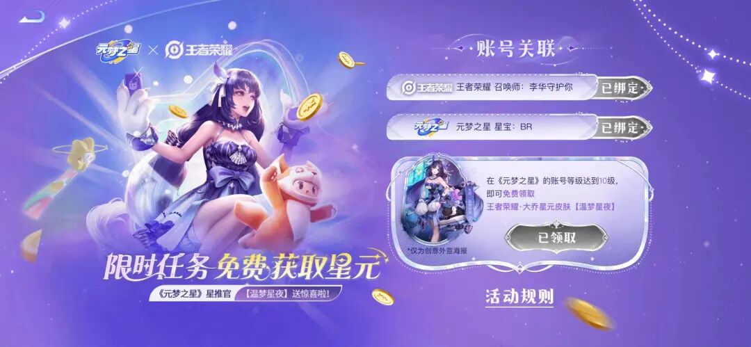 最后,我们来说一下王者荣耀跟元梦的联动皮肤,大乔新星元史诗温梦星夜,是需要达到10级才可以领取的哈。而且,这款星史诗在王者荣耀是值392点券的,多多少少都是马内啊。