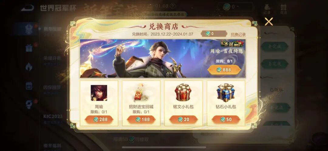 近期王者荣耀更新了圣诞节相关的活动,其中罕见出现了新史诗限定皮肤能够免费获得的活动。没错,周瑜雪夜绮愿限定,能够通过日活来获取。只不过,一天最多只能获得95个币,需要玩家完成9天的任务才能够兑换哦。