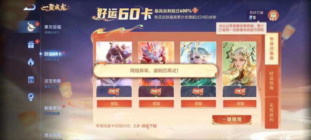 其实呢,这里我们要说到的,就是好运60卡了。虽然说每年都会有这个60卡,但是具体操作更划算,想必一些玩家还是懵懵懂懂的。没错,王者荣耀好运60卡的作用,目的就是让一些新皮肤在首周折扣的情况下,还能更加便宜。