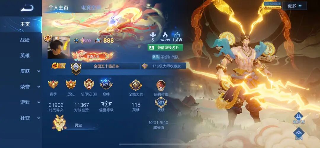 而且,这位富婆玩家的个人主页,也是很奢华,除了传奇王者段位之外,还有就是国服吕布称号,另外在皮肤数量方面,更是高达580+款皮肤哦,已经是全皮肤账号了。但是呢,全皮肤不算啥,因为这个王者荣耀账号还有更加炸裂的表现。