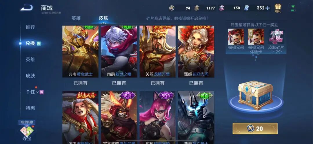 甚至,还有类似典韦黄金武士和扁鹊救世之瞳的888皮肤哈。在我看来,这次的碎片商店轮换,值得兑换的皮肤有阿轲的暗夜猫娘和兰陵王的暗隐猎兽者皮肤哦,你们觉得呢?