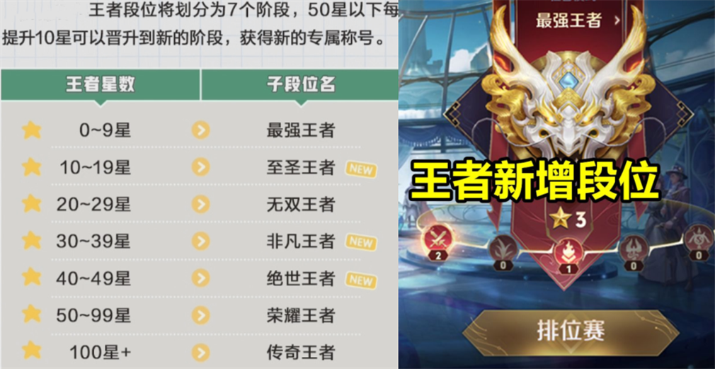 王者荣耀自从新增了星耀段位,还有后续的传奇王者和无双王者段位之后,这次又再次新增三个小段位。没错,分别是在王者10-19星的玩家,统称为“至圣王者”,30-39星的玩家统称为“非凡王者”,40-49星的则是称为“绝世王者”段位哦。