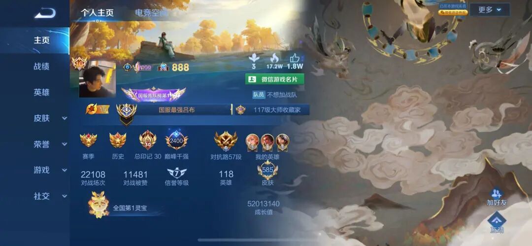 当然了,有不少玩家也吐槽太傻了,毕竟对于王者荣耀这款游戏而言,主要是以排位赛和巅峰赛为主。但是呢,在看到该玩家主页后却眼馋了,为什么呢?只因该玩家的主页太过华丽,无论是“全国第1灵宝”还是“全国贵族榜第1”这两个称号,还是585款皮肤,都足以是顶级王者荣耀账号了。甚至,他的灵宝成长值是“52013140”,其中的意思相信玩家们都知道吧?不得不说,花260W只为两个称号,你们认为值吗,反正我是眼馋了啊。各位玩家们,你们对此有什么想说的话,记得在留言区跟我交流沟通哈。
