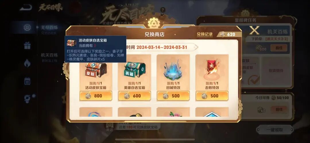 要知道哦,王者荣耀机关百炼模式已经开启了,玩家们可以通过闯关来获得积分。而且,这次的机关百炼活动商店中,还加入了永久皮肤自选宝箱,里面有老夫子、刘禅和张良的活动专属皮肤哦,只要完成任务拿到500积分的话要记得领哦。