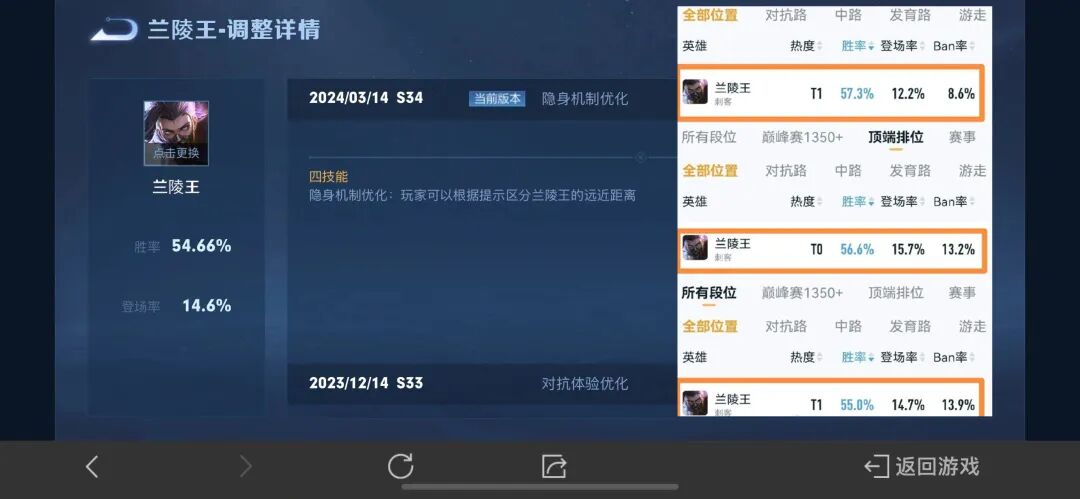 其实呢,王者荣耀当初在体验服调整兰陵王的时候,很多玩家都说这个打野英雄终于是要削废了。毕竟,新版兰陵王的大招被动,改成了距离敌人越近,那么标记就会越明显。而这个改动自从上架正式服之后,没想到兰陵王胜率暴涨,直接是全榜的第一位置。