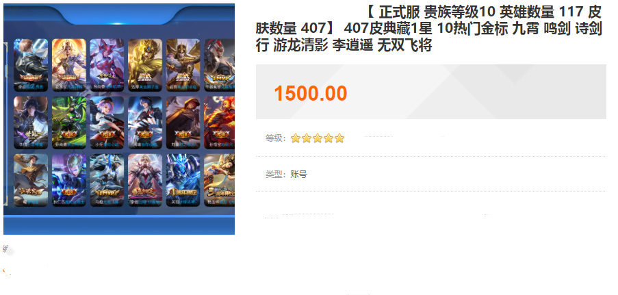 而这部分玩家的账号,一般都是被老玩家给收走的了。而我们今天要说的这个,就是老玩家花1500买的贵族V10账号哦。可以看到,这确实是1500马内,而且简单介绍中,是拥有英雄战力金标的,甚至连典藏皮肤都有哦,岂不是赚翻了?