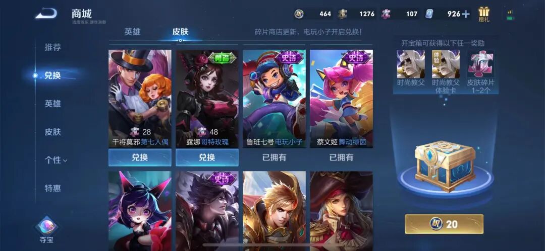王者荣耀S35赛季更新之后,会有刘邦的剑破天穹赛季皮肤登场,同时不知道会不会有护航典藏上线哦。但是呢,S35皮肤商城突变,因为碎片商店的皮肤会进行轮换哦。目前,王者荣耀的鲁班电玩小子,还有小乔缤纷独角兽史诗,都是值得兑换的哈。
