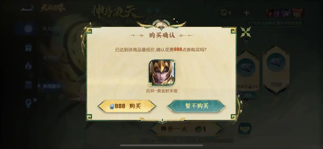 王者荣耀海月的新传说金乌负日限定已经上架,不过想要最低988点券的话,还是需要任务的。而此次的任务中,王者荣耀还加入了传说/史诗/勇者半价皮肤。其中,像后羿射手座传说皮肤,还是要记得领,毕竟只需要888点券而已啊。