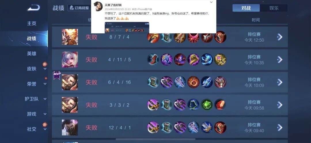 王者荣耀玩家排位九连败