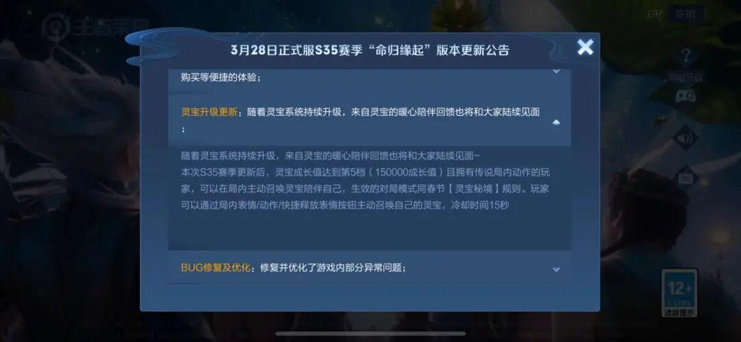 没错,王者荣耀龙年春节自从结束之后,灵宝秘境也是随之结束了。对于那些没有15万喂养值的玩家,他们的灵宝是不能出现在对局当中的,只能在玩家主页中看到。而这次,王者荣耀28号灵宝秘境返场,主要就是调整喂养值15万以上的玩家,修复他们的灵宝不能主动召唤的问题。