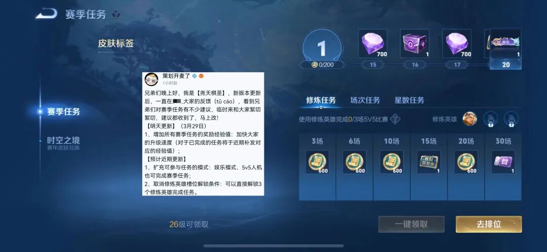 至于最后一个决定,那就是王者荣耀策划近期是真听劝。没错,王者荣耀赛季任务本来上线的时候,就遭到很多玩家吐槽,声称任务难度太大。所以,王者荣耀在听到玩家反馈之后,直接是将赛季任务的难度大大降低,即使是人机也能完成哦。